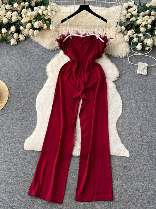 Feather Trim Strapless Wide Leg Jumpsuit